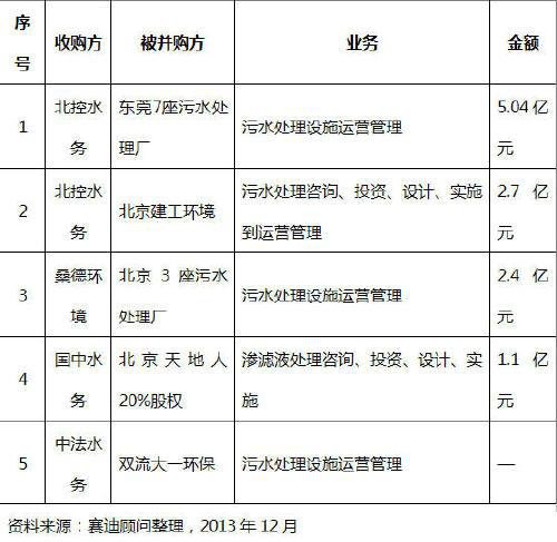 表 2 2013年污水處理行業(yè)并購(gòu)情況