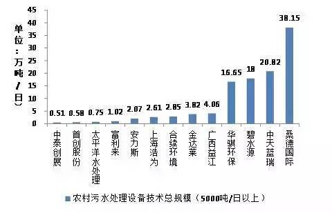 其中,農(nóng)村污水處理設(shè)備技術(shù)總規(guī)模大于5000噸/日以上企業(yè)排名如下圖所示: