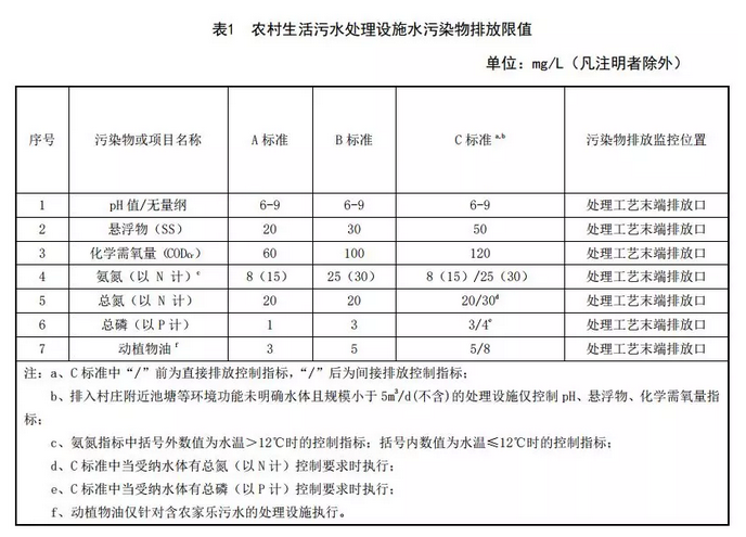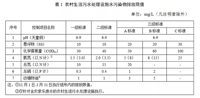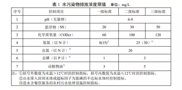 2.自本標(biāo)準(zhǔn)實(shí)施之日起,新(改、擴(kuò))建處理能力在500m3/d以下的農(nóng)村生活污水處理設(shè)施排水污染物最高允許排放濃度限值按表1規(guī)定執(zhí)行。