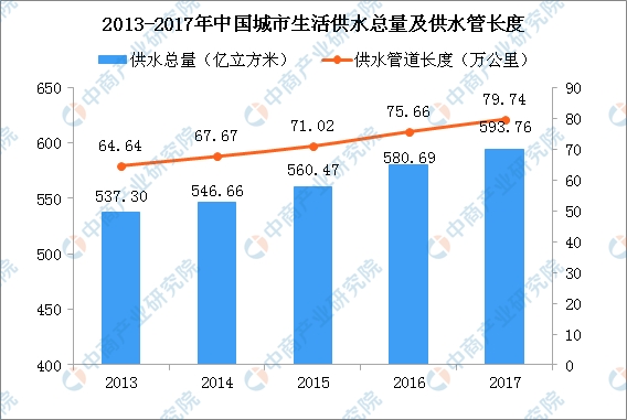城鎮(zhèn)化水平提升,城市基礎(chǔ)設(shè)施建設(shè)必然要適應(yīng)城市發(fā)展,將推動與人們?nèi)粘I钕⑾⑾嚓P(guān)的城市公共供水設(shè)施及其重要環(huán)節(jié)二次供水設(shè)施的建設(shè)。2013年至2017年,我國城鎮(zhèn)化率由53.73%提升至58.52%,相應(yīng)地每年生活供水總量由537.30億立方米增長至593.76億立方米,供水管道長度由64.64萬公里增加至79.74萬公里。如果不考慮城鎮(zhèn)供水普及率提升的影響,平均城鎮(zhèn)化率每提升1個百分點,供水管道長度需要增加2.71萬公里。