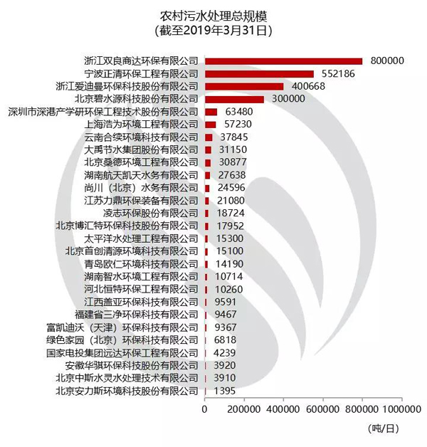 備注:該排名為企業(yè)中標(biāo)簽約的農(nóng)村污水處理項(xiàng)目設(shè)計(jì)能力加總,包含企業(yè)參與的投資建設(shè)運(yùn)營、委托維護(hù)、工程施工、設(shè)備供應(yīng)等環(huán)節(jié)的所有項(xiàng)目,并剔除重復(fù)計(jì)算等因素。