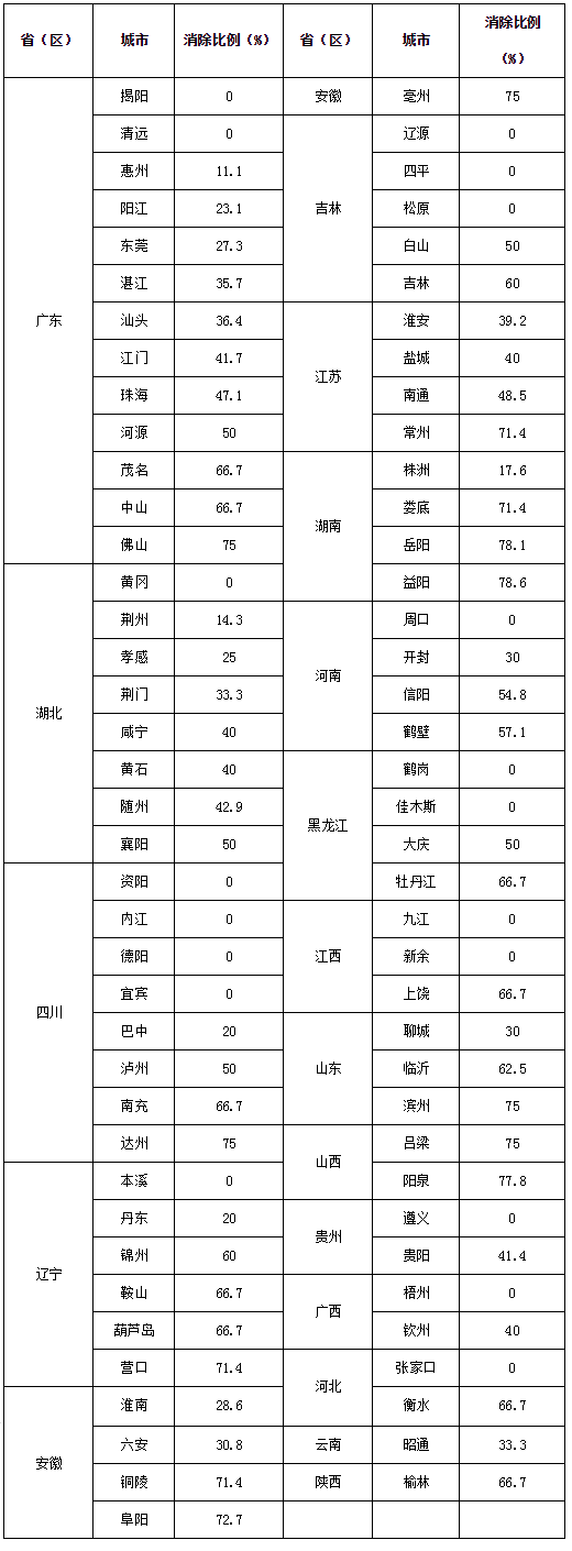 附表:黑臭水體消除比例低于80%的城市名單