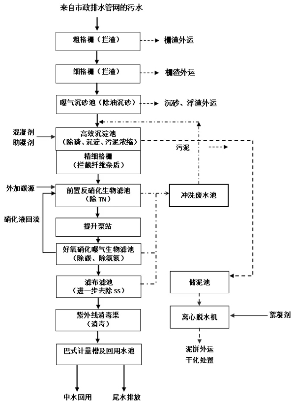 來(lái)自市政排水管網(wǎng)的污水先自流進(jìn)入粗格柵、細(xì)格柵,去除污水中較大雜質(zhì),然后進(jìn)入曝氣沉砂池內(nèi)進(jìn)一步除油沉砂。經(jīng)過(guò)預(yù)處理后的污水再進(jìn)入高效沉淀池,去除污水中的總磷和部分有機(jī)物。高效沉淀池出水經(jīng)過(guò)精細(xì)格柵進(jìn)一步攔截纖維雜質(zhì)后進(jìn)入前置反硝化生物濾池去除總氮,出水經(jīng)中間提升泵房提升至好氧硝化曝氣生物濾池,進(jìn)一步去除氨氮和有機(jī)物。曝氣生物濾池出水進(jìn)入濾布濾池進(jìn)一步去除懸浮物,再進(jìn)入紫外消毒渠進(jìn)行消毒處理,最后通過(guò)巴氏計(jì)量槽計(jì)量后尾水排放或中水回用。