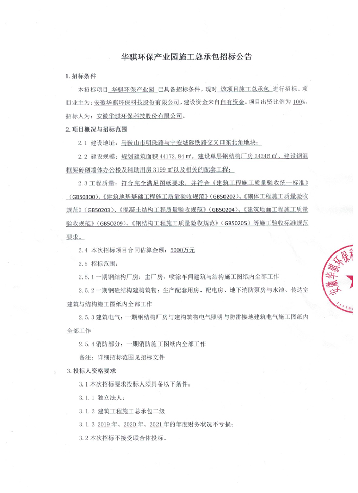 華騏環(huán)保產(chǎn)業(yè)園施工總承包招標公告