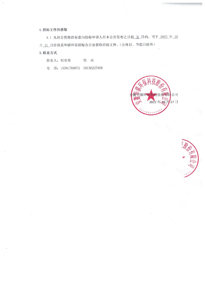4.1 凡符合資格的有意向投標申請人在本公告發(fā)布之日起 五 日內(nèi),可于 2022 年 10 月 31 日前聯(lián)系華騏環(huán)保招標辦公室獲取招標文件。(公休日、節(jié)假日除外)