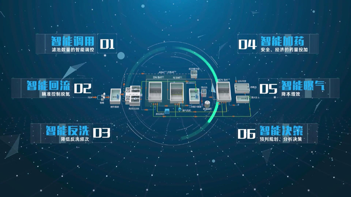 BAF智慧濾池智能調(diào)用、智能回流、智能反洗、智能加藥、智能曝氣、智能決策六駕“馬車”齊發(fā)力,充分發(fā)揮AI 人工智能在水廠運(yùn)營中的有力作用。智能調(diào)用系統(tǒng)自動(dòng)計(jì)算濾池運(yùn)行數(shù)量,根據(jù)用戶需求交替啟用,確保冬季低溫下出水水質(zhì)穩(wěn)定達(dá)標(biāo),同時(shí)降低曝氣能耗;智能回流系統(tǒng)實(shí)時(shí)調(diào)控回流比,解決了硝化液回流過量的問題,確保濾池精準(zhǔn)脫氮,大幅節(jié)省電耗;針對(duì)不同功能的濾池,智能反洗系統(tǒng)通過選用循環(huán)洗、降水位反沖洗、強(qiáng)制反洗等模式,提高反洗效率,降低反洗頻次,節(jié)省電耗;智能加藥系統(tǒng)結(jié)合進(jìn)水水質(zhì)水量,AI智能投加反硝化碳源,確??偟_(dá)標(biāo)的前提下大幅度降低藥耗;智能曝氣系統(tǒng)充分考慮氣泡經(jīng)濾料剪切帶來溶解氧升高的影響,實(shí)現(xiàn)按需供氧,降低曝氣能耗;智能決策系統(tǒng)根據(jù)運(yùn)營需求,對(duì)不同控制模塊的經(jīng)濟(jì)性、安全性、穩(wěn)定性進(jìn)行綜合比選,制定精準(zhǔn)、有效的控制方案。